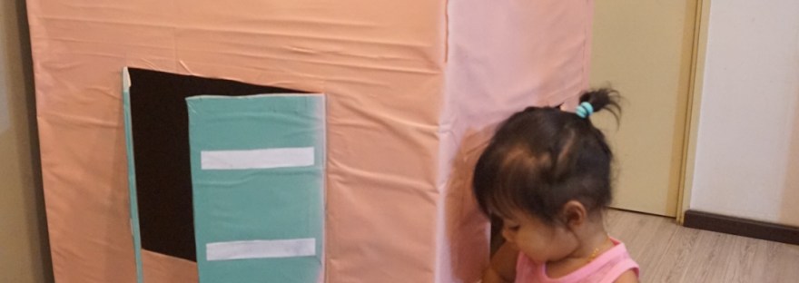 So we spent our New Year’s Eve at home building a cardboard playhouse from scratch for Nadya! Initially i wanted to use several medium sized boxes from Fedex and stack them up etc but Rusly found a huge box from our last fridge purchase in our storeroom and it was perfect!